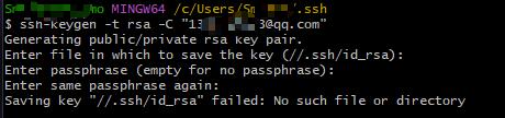 由于当时安装到深夜,有点没明白,后来上度娘搜寻答案,得知是因为找不到路径,因此需要在git-keygen命令执行后,手动添加.ssh文件的路径,再一路回车