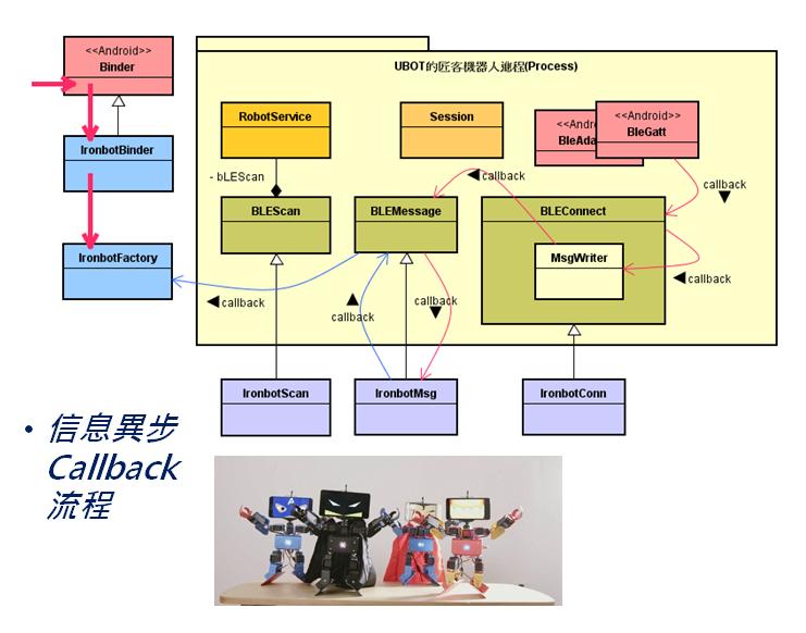 如果您使用蓝芽来控制多机器人互动,就可以利用UBOT的蓝芽模块(UBOT框架包含许多不同的机器人通信模块)来减轻您的编程工作负担。UBOT采取与Android一样的开源模式,其应用框架层是开源的、API是开放的。提供给广大的App开发者来设计自己的UI操作画面,以及与机器人衔接的底层插件(Stub)模块。这些App和Stub软件模块,则由其开发者自有决定是否免费开源,或者闭源收费。UBOT协助App开发整理出一致地手机内蓝芽信息传递流程及机器人信息回调(Callback)的处理流程,来有效减轻App开发者和维护者的工作负担。