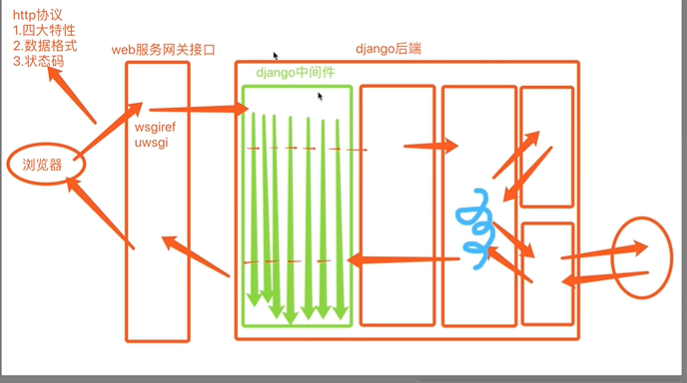 浏览器-web网关-django中间件-url-view-template-model-数据库!!