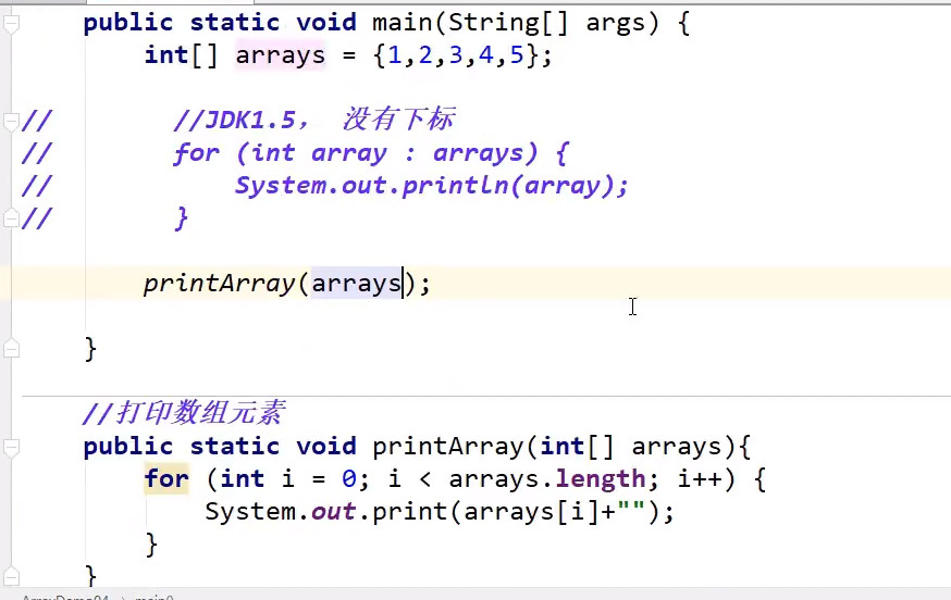 int arrays[]={1,2,3,4,5}; for(int i=0 ;i<arrays.length;i++){ System.out.println("第"+i+"个数是"+arrays[i]); }