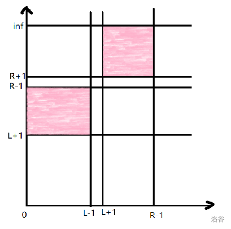 那么在平面直角坐标系中,有两个矩形,其中一个的顶点为 \((0,L+1)\) 和 \((L-1,R-1)\),另一个的顶点为 \((L+1,R+1)\) 和 \((R-1,inf)\),在这两个矩形之一中的任意一点 \((l,r)\) 都满足要求。如图。