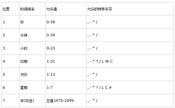 0 10,44 14 ? 3 WED 3月分每周三下午的 2点10分和2点44分触发 (特殊情况,在一个时间设置里,执行两次或 两次以上的情况)