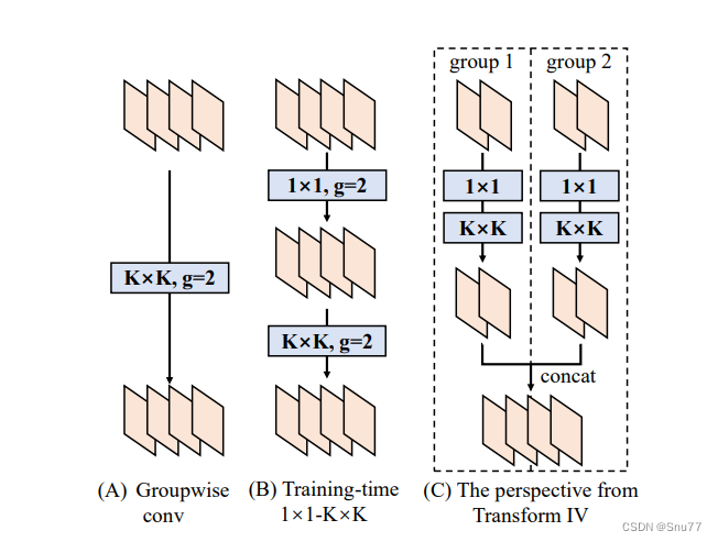 A)组卷积(Groupwise conv):将输入分成多个组,每个组使用不同的卷积核。 B)训练时的1x1-KxK结构:首先应用1x1的卷积(减少特征维度),然后是分组的KxK卷积。 C)从转换IV的角度看:这是将多个分组的卷积输出合并的视角。这里,组内卷积后的特征图先分别通过1x1卷积处理,然后再进行拼接(concat)。