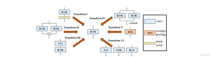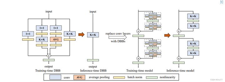 可以看到右侧的框显示了经过这些转换后,可以实现的推理时DBB,其中包含了常规卷积、平均池化和批量规范化操作。这些转换确保了在不增加推理时负担的同时,能够在训练时利用DBB的多样化特征提取能力。