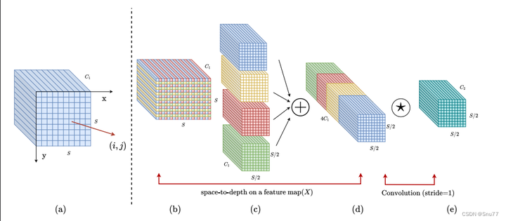 ,高度和宽度。 2. 空间到深度变换 (b):通过空间到深度操作,将像素的空间块重新排列到深度/通道维度,增加通道数到 4