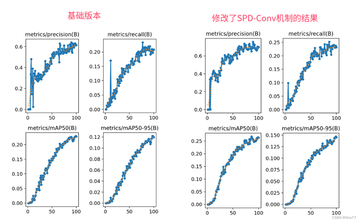 上图比较了标准YOLOv5m模型和集成了SPD-Conv的改进版本YOLOv5-SPD-m的性能。紫色框表示标准YOLOv5m的预测,绿色框显示了YOLOv5-SPD-m的预测。蓝色框代表地面真相(ground truth)。红色箭头突出了两个模型预测之间的差异。