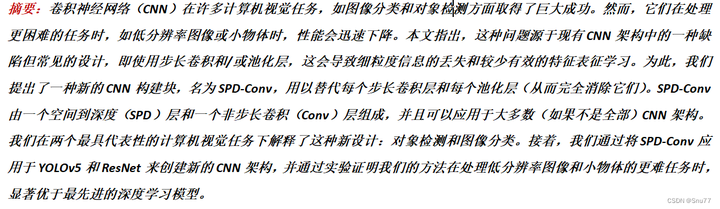 论文中提出的SPD-Conv构建块是为了替代传统CNN中的步长卷积和池化层。步长卷积和池化层在处理低分辨率图像和小物体时会导致信息的丢失。SPD-Conv使用空间到深度(SPD)层,该层将特征图的空间维度转换成深度维度,通过增加通道数来保留更多信息。随后是非步长卷积层,它保持了空间维度,减少了通道数。这种替代方法避免了信息的丢失,并允许网络捕获更精细的特征,从而提高了在复杂任务上的性能。