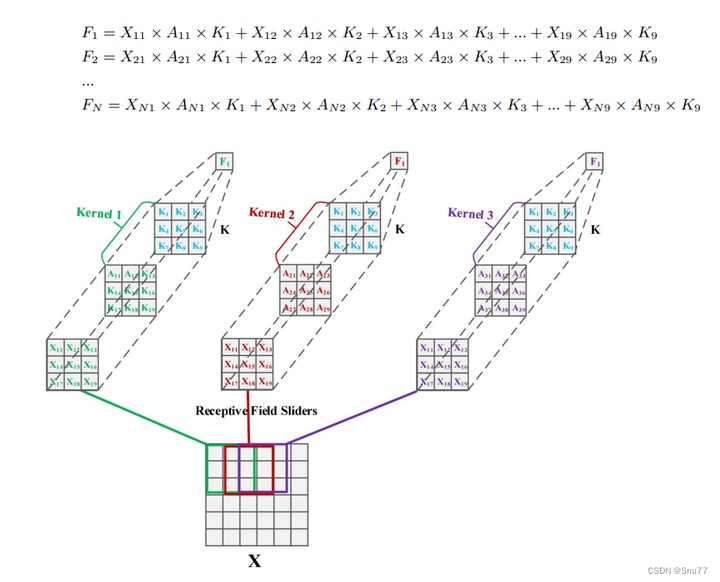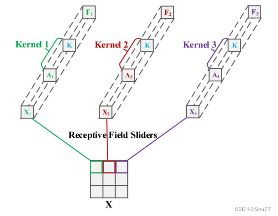具体地说,这个过程将注意力机制与卷积核相结合,为每个感受野位置产生一个定制化的卷积核。例如,图中的 Kernel 1、Kernel 2 和 Kernel 3 分别是通过将通用卷积核参数 K 与对应的注意力权重相乘得到的。这种方法允许网络在特征提取过程中对不同空间位置的特征赋予不同的重要性,从而增强了模型对关键特征的捕获能力。