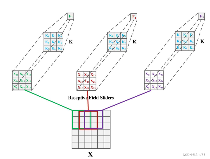 上图展示了一个3x3的卷积操作。在这个操作中,特征是通过将卷积核与同样大小的感受野滑块相乘然后求和得到的。具体来说,输入图像X上的每一个3x3的区域(即感受野)都被一个3x3的卷积核K处理。每个感受野内的元素,