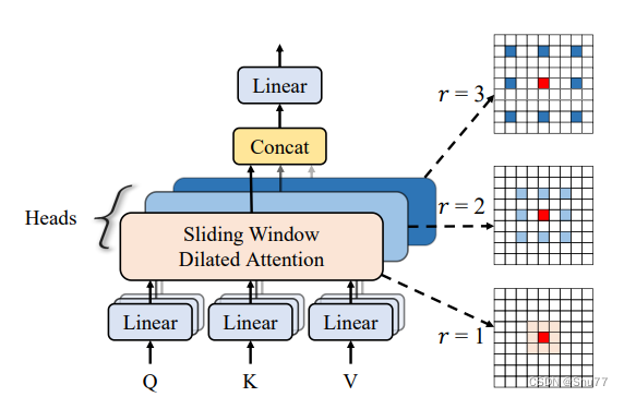 图中的例子展示了三种不同的扩张率(r=1, 2, 3)(这里需要注意的是咱们我的网络中需要改成四种的扩张率),它们分别对应不同的感受野大小(3x3, 5x5, 7x7)。每个头部的自注意力操作针对的是其对应的扩张率和感受野。这样,模型能够在不同的尺度上捕捉图像特征,这些特征随后被连接在一起,并送入一个线性层进行特征聚合。