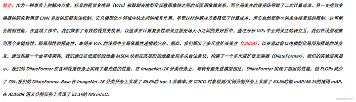 在DilateFormer论文中,多尺度扩张注意力(MSDA)模块是为了利用自注意机制在不同尺度上的稀疏性。MSDA通过线性投影得到特征图X的相应查询、键和值。然后,将特征图的通道分成n个不同的头部,并在不同的头部中以不同的扩张率执行多尺度SWDA。具体来说,MSDA被公式化如下:对于每个头部i,进行SWDA操作,并且对所有的输出进行连接后送入一个线性层进行特征聚合。通过为不同的头部设置不同的扩张率,MSDA能够在被关注的接受域内有效地聚合不同尺度的语义信息,并在不需要复杂操作和额外计算成本的情况下有效地减少自注意机制的冗余