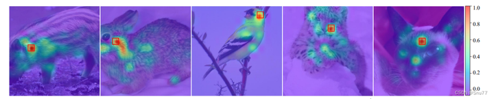 这幅图展示了ViT-Small的第三个多头自注意力(Multi-Head Self-Attention, MHSA)块的注意力图的可视化。在每张图中,一个特定的查询块(红色框内的区域)被用来展示其它各个块对它的注意力程度。注意力图显示了具有高注意力得分的块在查询块周围稀疏分布,而其它块的注意力得分较低。