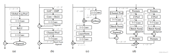 4. Triplet Attention (我们的方法): 分为三个分支,每个分支进行不同的处理:通道池化后的7x7卷积,Z池化,再接一个7x7卷积,然后是批量归一化和Sigmoid函数。每个分支都有一个Permute操作来调整维度。最后,三个分支的结果通过平均池化聚合起来生成最终的注意力权重。