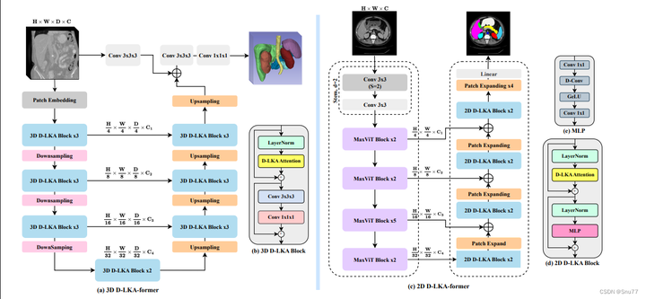 2. 2D D-LKA模型(右侧):利用MaxViT块作为编码器组件,并在不同的分辨率级别上使用2D D-LKA块,通过扩展(Patch Expanding)和D-LKA注意力机制进行特征学习。