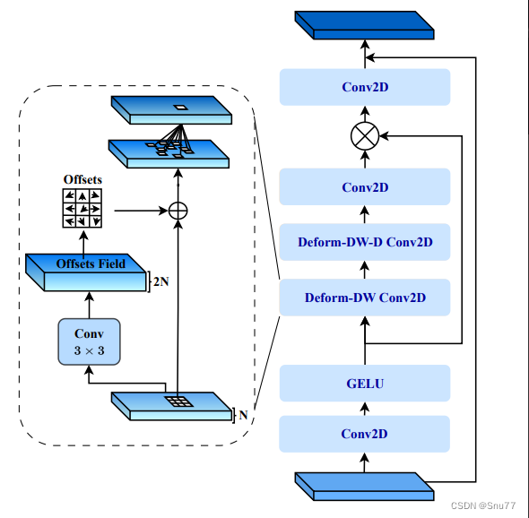 1. 标准的2D卷积(Conv2D)。 2. 带有偏移量的变形卷积(Deformable Convolution, Deform-DW Conv2D),允许网络根据输入特征自适应地调整其感受野。 3. 偏移场(Offsets Field)的计算,它是由一个标准卷积层生成,用于指导变形卷积层如何调整其采样位置。 4. 激活函数GELU,增加非线性。