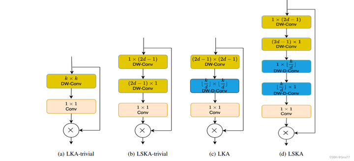 原始LKA设计:在VAN中包括标准深度卷积(DW-Conv)、扩张深度卷积(DW-D-Conv)和1×1卷积(图c)。