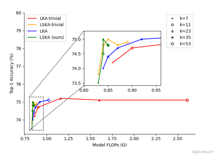 上图展示了在不同大核分解方法和核大小下的速度-精度权衡。在这个比较中,使用了不同的标记来代表不同的核大小,并且以VAN-Tiny作为对比的模型。从图中可以看出,LKA的朴素设计(LKA-trivial)以及在VAN中的实际设计,在核大小增加时会导致更高的GFLOPs(十亿浮点运算次数)。相比之下,论文提出的LSKA(Large Separable Kernel Attention)-trivial和VAN中的LSKA在核大小增加时显著降低了GFLOPs,同时没有降低性能