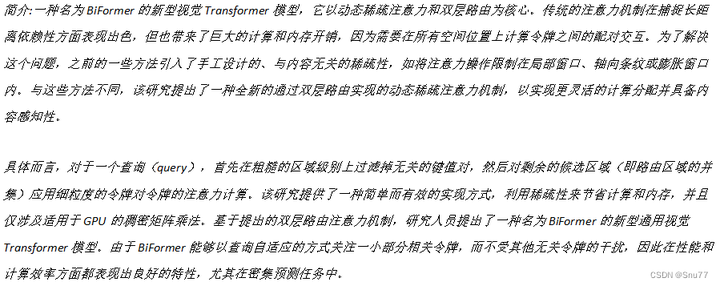 劣势: 1. 可能存在信息损失:由于BiFormer采用了稀疏注意力机制,只关注最相关的键-值对,可能会导致一些次要的或较远的关联信息被忽略。这可能会在某些情况下导致模型性能的下降。