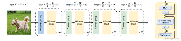上图展示了BiFormer的整体架构和一个BiFormer块的详细信息。
