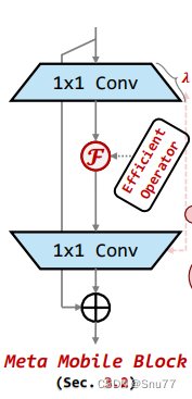 图中展示的是Meta Mobile Block的设计。在这个构件中,1x1的卷积层被用来改变特征图的通道数,从而控制网络的容量。中间的“Efficient Operator”是一个高效的运算符,可以是自注意力机制或其他任何高效的层或操作。这种设计使得Meta Mobile Block能够灵活地适应不同的任务需求,并保持高效的计算性能。通过这样的模块化,网络能够在不同的环境和任务中进行快速调整和优化。