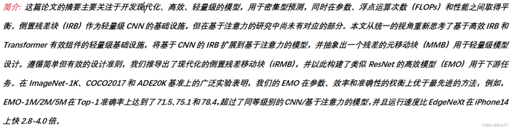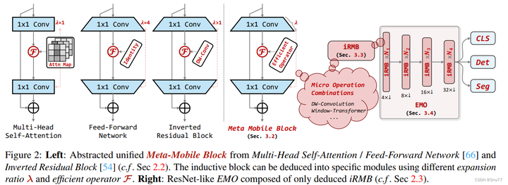 上面的图片来自与论文的图片2展示了iRMB(Inverted Residual Mobile Block)的设计理念和结构。左侧是从多头自注意力和前馈网络中抽象出的统一元移动块(Meta-Mobile Block),它将不同扩展比率和高效操作符结合起来,形成特定的模块。右侧是基于iRMB构建的类似ResNet的高效模型(EMO),它仅由推导出的iRMB组成,并用于各种下游任务,如分类(CLS)、检测(Det)和分割(Seg)。这种设计实现了模型的轻量化,同时保持了良好的性能和效率。