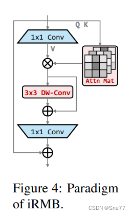 这幅图展示了iRMB(Inverted Residual Mobile Block)的结构范式。iRMB是一种混合网络模块,它结合了深度可分离卷积(3x3 DW-Conv)和自注意力机制。1x1卷积用于通道数的压缩和扩张,以此优化计算效率。深度可分离卷积(DW-Conv)用于捕捉空间特征,而注意力机制则用于捕获特征间的全局依赖关系。