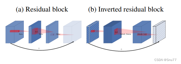 (a) 残差:传统的残差块通过直接连接输入和输出来促进特征的传递,通常包含具有高通道数的层和ReLU激活函数。 (b) 反转残差块:在反转残差块中,连接是在瓶颈层之间,即通道数较少的层,而且去除了非线性激活函数,以保持特征的表达力。这种设计通常首先用一个扩展层增加通道数,然后应用深度卷积处理特征,并且在最后一个线性层减少通道数。