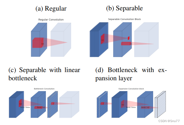 (a) 展示了常规的卷积。 (b) 展示了可分离卷积块,这种块首先使用深度卷积分别处理每个输入通道,然后用一个1x1的卷积组合这些特征。 (c) 展示了带有线性瓶颈的可分离卷积,它在瓶颈层中移除了非线性激活函数,以保持特征的表达力。 (d) 展示了带有扩展层的瓶颈结构,它使用一个扩展层放大特征空间,然后再用深度卷积和1x1卷积进行处理。
