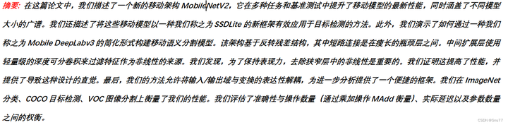 MobileNetV2是在MobileNetV1基础上提出来的,其不光具有V1的全部改进,还提出了采用反转残差结构和线性瓶颈层。这种结构通过轻量级的深度卷积和线性卷积过滤特征,同时去除狭窄层中的非线性,以维持表征能力。MobileNetV2通过这种设计提高了性能,并在多种任务和基准测试上表现出色。此外,它提出了一种新的框架SSDLite,用于移动设备上的目标检测,并展示了如何构建移动语义分割模型Mobile DeepLabv3。这种方法允许输入/输出域与变换的表达力解耦,为进一步分析提供了方便的框架。