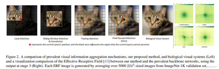 编辑这幅图展示了不同视觉信息聚合机制的比较,包括提出的方法和生物视觉系统。通过平均超过5000张224²分辨率的ImageNet-1K验证集图像,展示了不同方法与流行背景网络之间的有效感受野(ERF)的可视化对比。图中展示了四种不同的注意力机制:局部注意力、滑动窗口注意力与卷积、池化注意力,以及本文提出的像素聚焦注意力,以及它们与生物视觉系统的对比。每种机制下,红星表示当前查询的位置,黑色区域表示当前查询无法感知的区域。右侧的图表比较了TransNeXt(本文提出的方法)和其他几种流行的模型在处理视觉信息时的差异。
