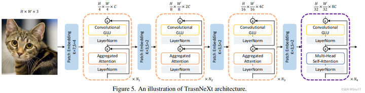 图5展示了TransNeXt架构的一个示意图,揭示了其内部的组件和数据流。这个架构通过多个阶段的处理来处理输入图像,其中每个阶段都包含卷积GLU和聚合注意力机制的层。以下是每个阶段的详细介绍: