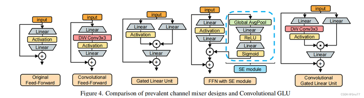 图4展示了当前流行的通道混合器设计与卷积GLU(Convolutional Gated Linear Unit)的比较。四个框架分别表示: