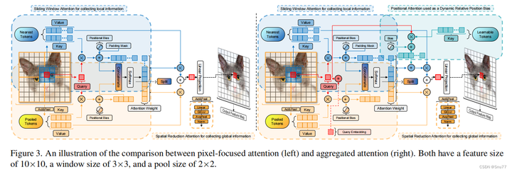 在像素聚焦注意力的基础上增加了一些关键的组件来形成聚合注意力。引入了位置注意力,它作为动态相对位置偏差使用,和可学习的令牌相结合,来增强模型对位置的感知能力。