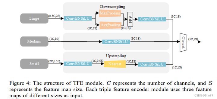 编辑图4展示了三重特征编码器(TFE)模块的结构。C代表通道数,S代表特征图大小。每个三重特征编码器模块使用三种不同大小的特征图作为输入。该模块通过卷积、批归一化和SiLU激活函数对特征进行处理,并使用最大池化和平均池化进行下采样,以及最近邻上采样方法进行上采样,最后通过Concat操作合并特征,生成综合的特征表示。