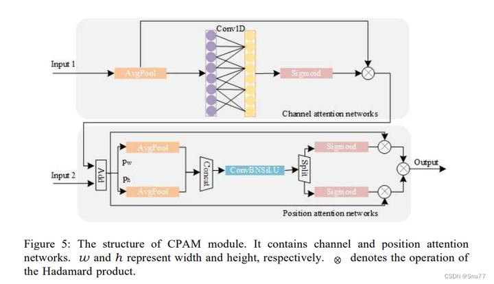 这张图展示了通道和位置注意力机制(CPAM)模块的结构。该模块包括通道注意力网络和位置注意力网络两部分。通道注意力部分通过平均池化和1D卷积来生成每个通道的权重,然后使用Sigmoid函数进行归一化。位置注意力网络分别对宽度和高度进行平均池化,再通过一个卷积层和Sigmoid函数生成空间权重。最后,这两个权重通过哈达玛积(元素间相乘)合并,以产生最终的加权输出,增强模型对特定通道和位置的聚焦能力。