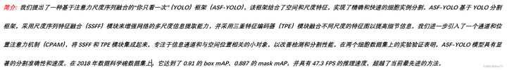 本文给大家带来的改进机制是ASF-YOLO(发布于2023.12月份的最新机制),其是特别设计用于细胞实例分割。这个模型通过结合空间和尺度特征,提高了在处理细胞图像时的准确性和速度。在实验中,ASF-YOLO在2018年数据科学竞赛数据集上取得了卓越的分割准确性和速度,达到了0.91的box mAP(平均精度),0.887的mask mAP,以及47.3 FPS的推理速度,效果非常的好,这个结构本来是用于分割的,我将其移植到了目标检测的模型上,所以其可以适用于分割和目标检测,当然其它的领域也可以用但是对于分割的同学效果是最好的,目标检测领域也有一定涨点效果,同时欢迎大家订阅本专栏,本专栏每周更新3-5篇最新机制,更有包含我所有改进的文件和交流群提供给大家。