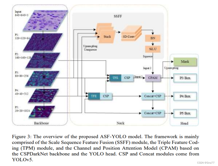 这张图展示了ASF-YOLO模型的概览。模型主要包括尺度序列特征融合(SSFF)模块、三重特征编码(TFE)模块,以及基于CSPDarkNet主干网络和YOLO头部的通道和位置注意力模型(CPAM)。CSP和Concat模块来自于YOLOv5。在这个框架中,输入图像通过主干网络的不同层(P1到P5)进行特征提取,然后通过SSFF和CPAM模块进行特征融合和注意力加权,最终实现分割掩模的生成和不同尺度的边界框(P3,P4,P5 Box)的预测。