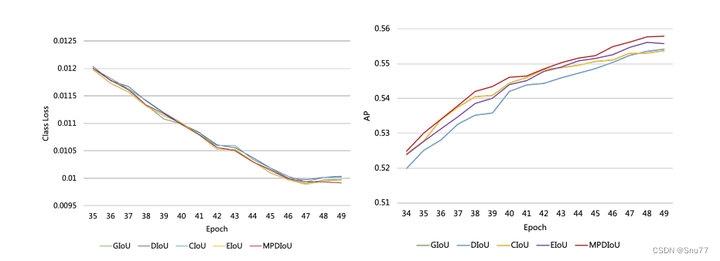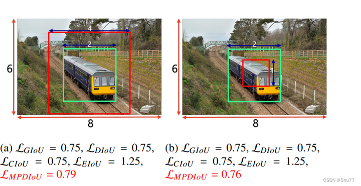 这个发现突显了MPDIoU在处理边界框回归问题上的优势,尤其是在区分具有相同宽高比但不同尺寸或位置的边界框时。MPDIoU通过直接计算预测框和真实框之间的关键点距离,提供了更精确的损失度量方法。