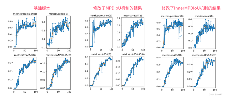 分析下这个结果图片:最左面的是基础版本没做任何修改的,中间的只是修改了MPDIoU可以看到涨点相对于基础版本的大概有0.05个点左右,但是我增加了InnerMPDIoU的效果基本持平(我个人觉得是我的数据集原因)所以大家自己进行实验的时候可以多做一轮进行一下对比。