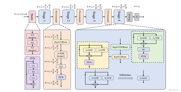 Stage1-4:每个阶段由多个RepViTBlock组成,以及一个可选的RepViTSEBlock,包含深度可分离卷积(3x3DW),1x1卷积,压缩激励模块(SE)和前馈网络(FFN)。每个阶段通过下采样减少空间维度。