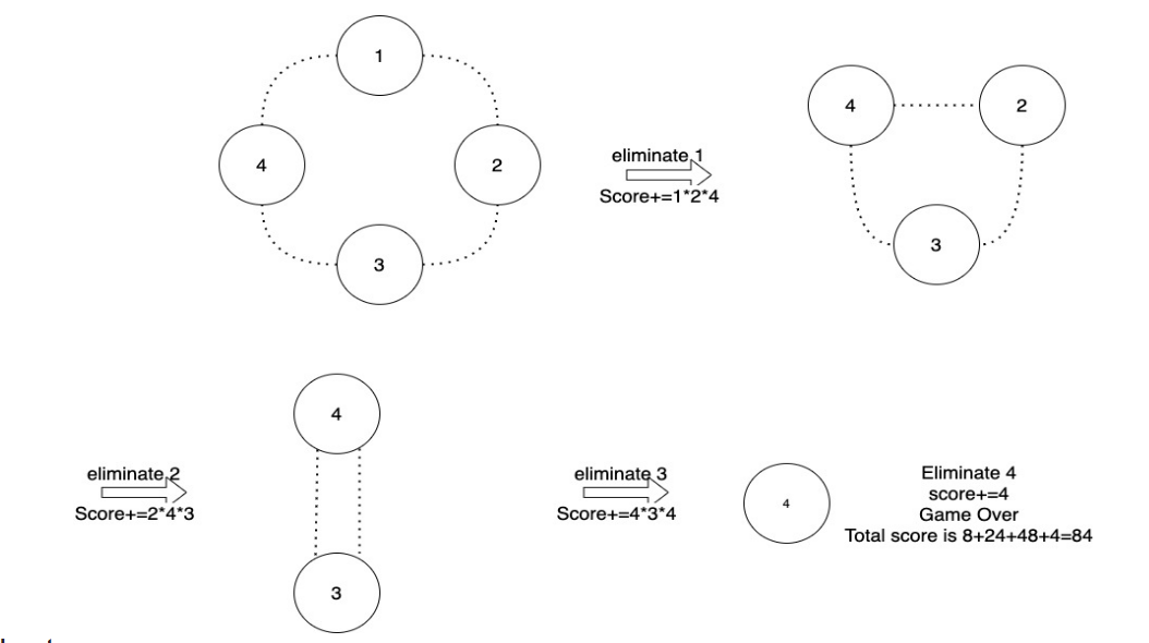 开心消消乐是一个在大圆环上进行的游戏,环上有若干个宝石,每颗宝石都有自己的积分,由于消消乐是一个三消游戏,我们每次可以挑选其中一个宝石消去,消去宝石的积分为他的积分和左右相邻宝石积分的乘积,比如下左图中,消去 \(1\) 的积分就是 \(1 \times 2 \times 4\),如果剩下最后 \(2\) 颗宝石,比如下图中,消去 \(3\) 的积分是\(4 \times 3 \times 4\),如果剩下最后 \(1\) 颗宝石,消去的积分就是他自身的分数。