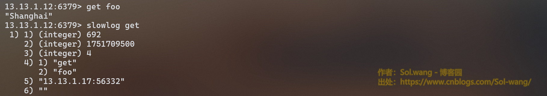 当一条命令执行时间超过限制时,Redis 会将该命令的执行时间等信息加入耗时命令日志以供查看。可通过配置文件 Redis.conf 的 slowlog-log-slower-than 参数设置这一限制,要注意单位是微秒,默认为10000。通过 SLOWLOG GET 命令来获得当前的耗时命令日志(当然,我是在集群模式下),如下图: