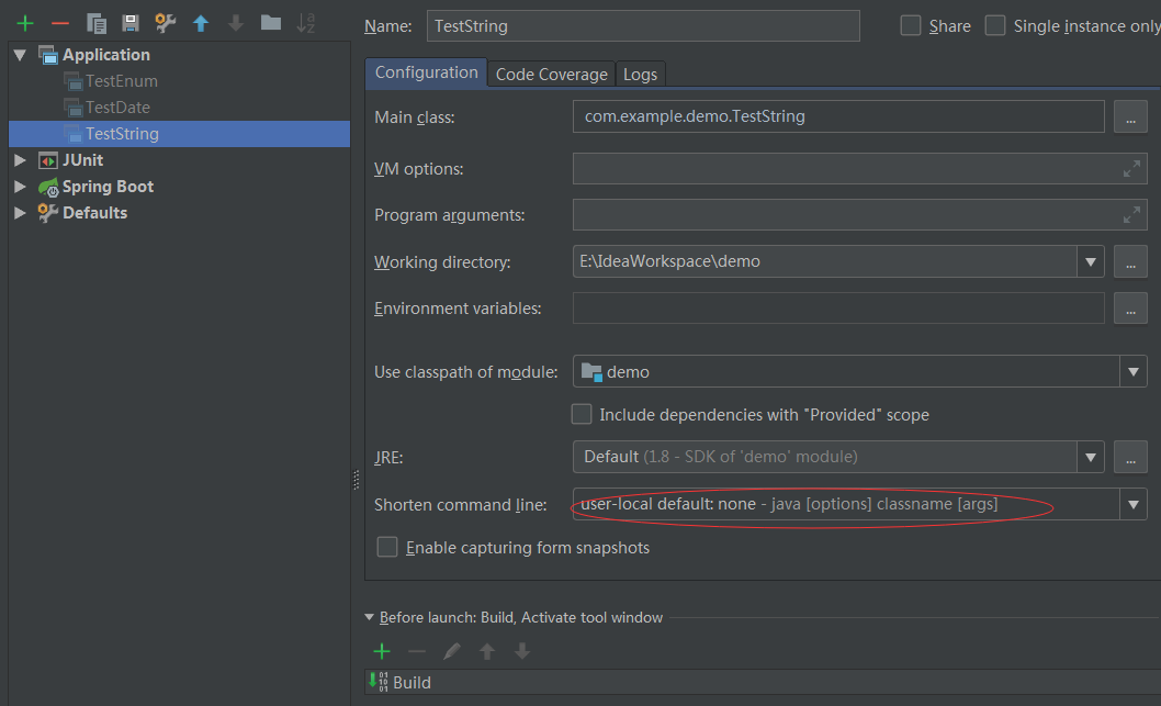 总会报这个错,然后点进去default 时想看看以前那个设置 “ Shorten command line” 的地方,找了半天没找到,这是 idea 2021 版本之前设置时的截图(我从别处盗的)