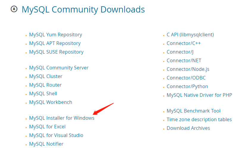 (选择windows安装工具进行下载,使用installer for windows安装简单快捷,但是不能设置mysql安装目录;mysql community server 虽然可以设置mysql安装目录,但是安装比较繁琐,需要配置环境变量和执行命令行)