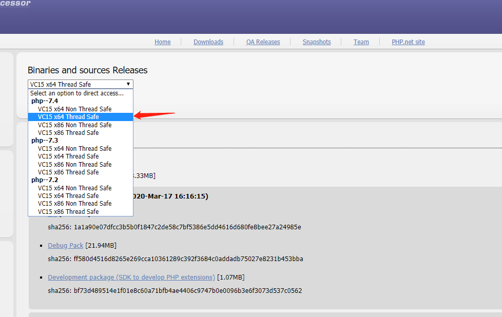 (选择你需要的php版本,一定要下载thread safe的,64位或32位要跟apache统一!)