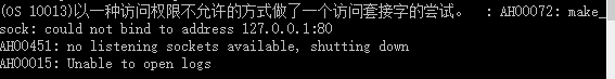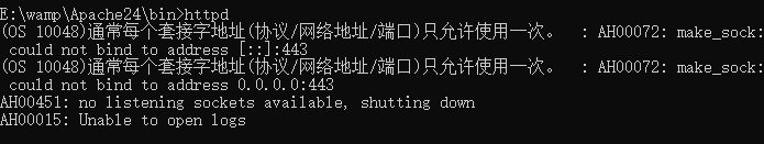(OS 10048)通常每个套接字地址(协议/网络地址/端口)只允许使用一次。 : AH00072: make_sock: could not bind to address [::]:443 (OS 10048)通常每个套接字地址(协议/网络地址/端口)只允许使用一次。 : AH00072: make_sock: could not bind to address 0.0.0.0:443 AH00451: no listening sockets available, shutting down AH00015: Unable to open logs