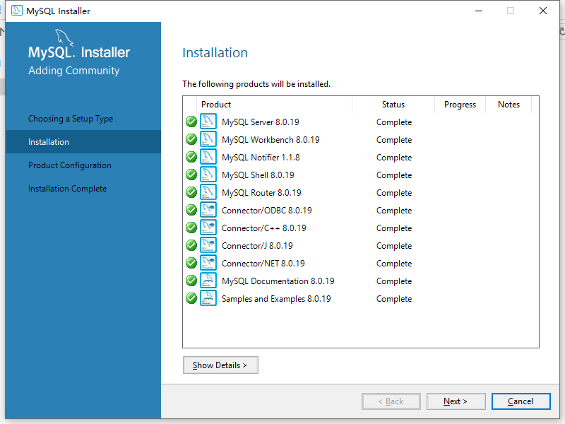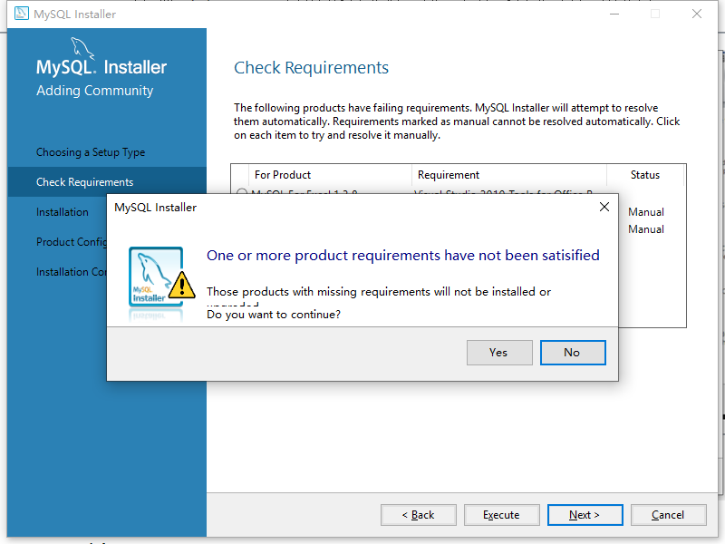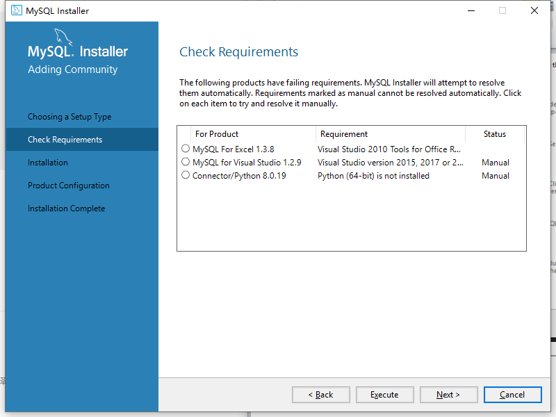 1.2 点击下一步后,这一步msyql installer检查依赖,下面列出来的是安装mysql产品所需要的依赖,其中status标识为Manual的是不能自动安装的依赖。这里第一个产品mysql for excel可以自动安装依赖,那就让他自己安装就可以,后面两个虽然不能自动安装依赖,但是一个是VS的mysql插件,一个是MySQL的python连接器,这里我们使用的语言是PHP,所以这两个可以不管它们。点击next,弹窗下一步说。