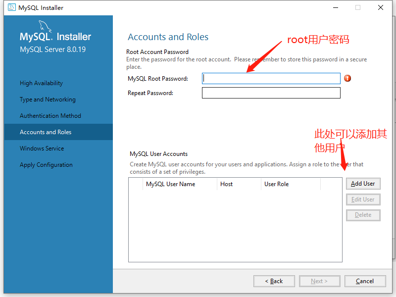 (底下Add User可以添加其他用户,不过不用在这里加,可以安装完用客户端加)
