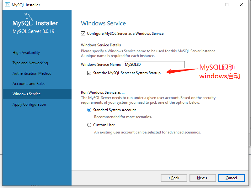 1.10 这里是选择MySQL server是否跟随windows启动,默认就是勾选的,点next。