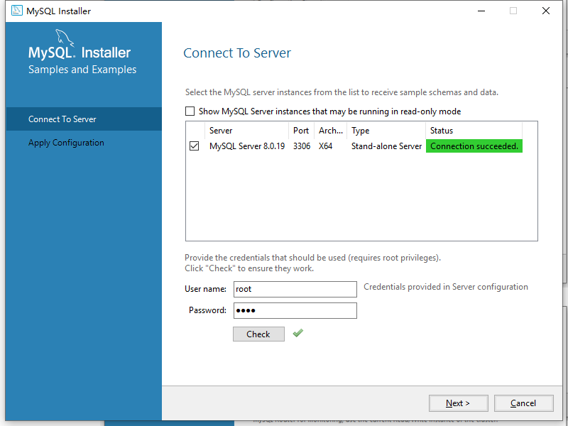 1.14 这里是检测MySQL是否安装成功,底下输入你的username和password,点check,会有提示。通了之后直接next